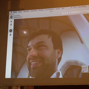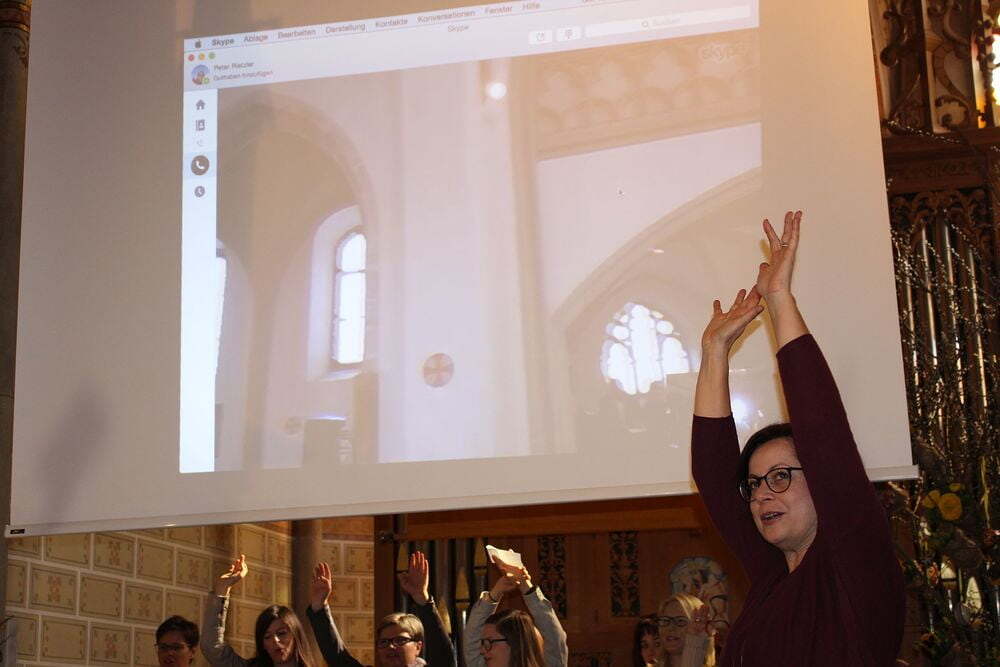 Dank an Peter für die Technik. Das wird uns als Weltpremiere vermutlich einen Eintrag im Guiness-Buch der Rekorde bringen. Gleichzeitiges gemeinsames Singen desselben Liedes in zwei Kirchen via skype. Zwei Pfarren, zwei Kirchen, ein Lied. Schönering (mit erhobenen Händen): Hallelu, Hallelu, Hallelu, Halleluja. Alkoven (mit erhobenen Händen): Lobet den Herrn …
